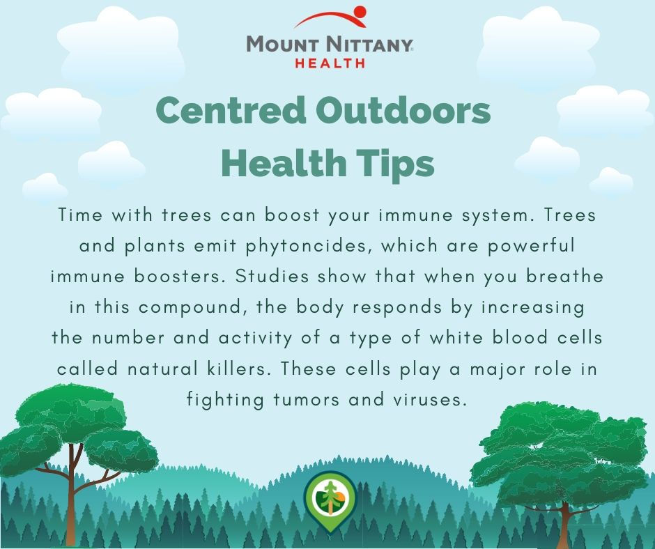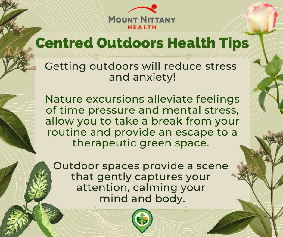 Below are a variety of health tips and facts about the countless benefits of spending time outside. This information has been provided by regional health experts at Mount Nittany Health, a partnering organization for Centred Outdoors.